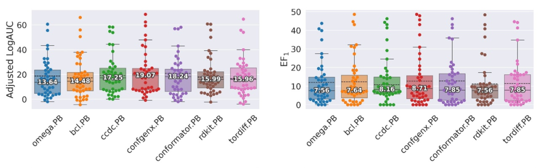 研究人员还在DUDE-Z数据集上测试了各采样方法在分子对接中的回顾性筛选能力。DUDE-Z数据集包含43个已知蛋白靶标,每个靶标下有数十个已知活性小分子,每个活性小分子对应50个物理性质相似但结构不同的诱饵分子。筛选能力反映了对接软件从化合物库中富集活性小分子的能力。整体来看,ConfGenX展现了较优的回顾性筛选能力,其LogAUC和EF1的中位数分别为19.07和8.71。由于不同靶点的活性分子化学结构各异,且结合口袋的性质不同,采样方法在各靶点上的筛选能力表现出较大差异。具有不同采样偏好的方法在不同靶点上各自展现出最佳的筛选能力。