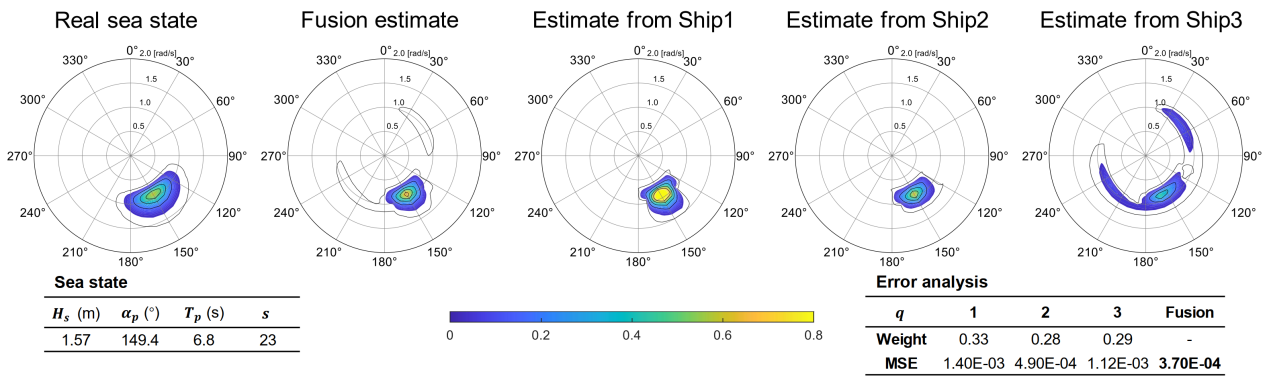 基于受限等距特性的分析视角,可为性能评估提供有效判据,通过仅使用传递函数作为输入,预判船舶对海浪感知的能力。此外,该方法还可作为特定海况下的可信度指标。由于海上作业通常涉及多条船舶,不同尺寸的船舶对波浪的敏感性各异,将性能判据作为权重引入多谱融合框架,可以实现多船海况估计的协同优化,从而获得更加鲁棒且准确的海况估计结果。
